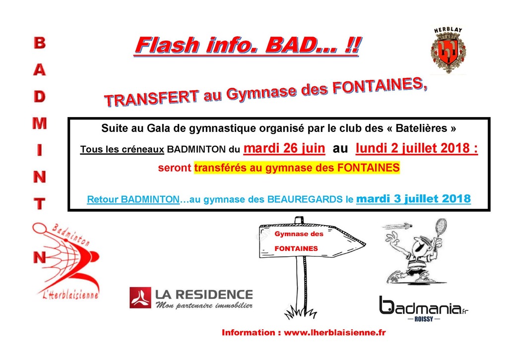 Suite au gala de Gymnastique organisé par le club des BATELIERES, merci de noter le transfert des créneaux BADMINTON au gymnase des Fontaines pour la période indiquée