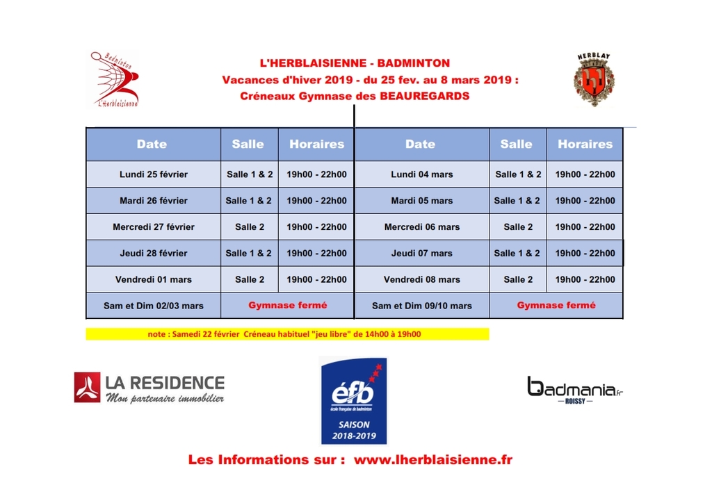 Voici les créneaux jeu libre pour la période des congés scolaires du 22 février après les cours au 8 mars 2019