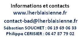 Les inscriptions sont ouvertes. Les documents qui vous permettront de vous inscrire sont disponibles dans la rubrique BADMINTON : Informations et contacts contact-bad@lherblaisienne.fr Sébastien SOUCHET : 06 19 69 06 33 Philippe CERISIER : 06 47 87 79 02