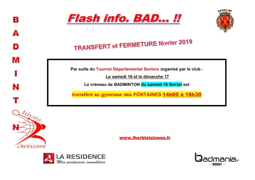 Ci-joint l'information du transfert vers le gymnase des FONTAINES pour le samedi 16 février 2019